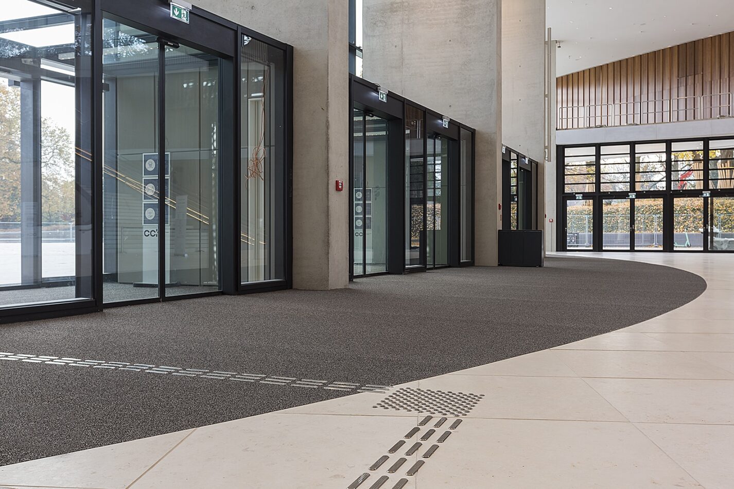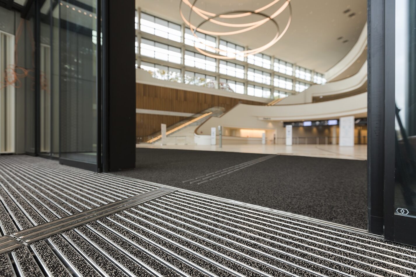Nur so kann das Foyer seine eindrucksvolle Wirkung optimal ausspielen und der Reinigungsaufwand stark minimiert werden. Die emco Produkte sind ein Baustein zu einem nachhaltigeren Wirtschaften. Das ebenfalls verbaute taktile Leitsystem SPIN®SAFE sichert den barrierefreien und lückenlosen Zugang für Menschen mit einer Sehbehinderung, gibt ihnen Orientierung und leitet sie durch den Eingangsbereich.