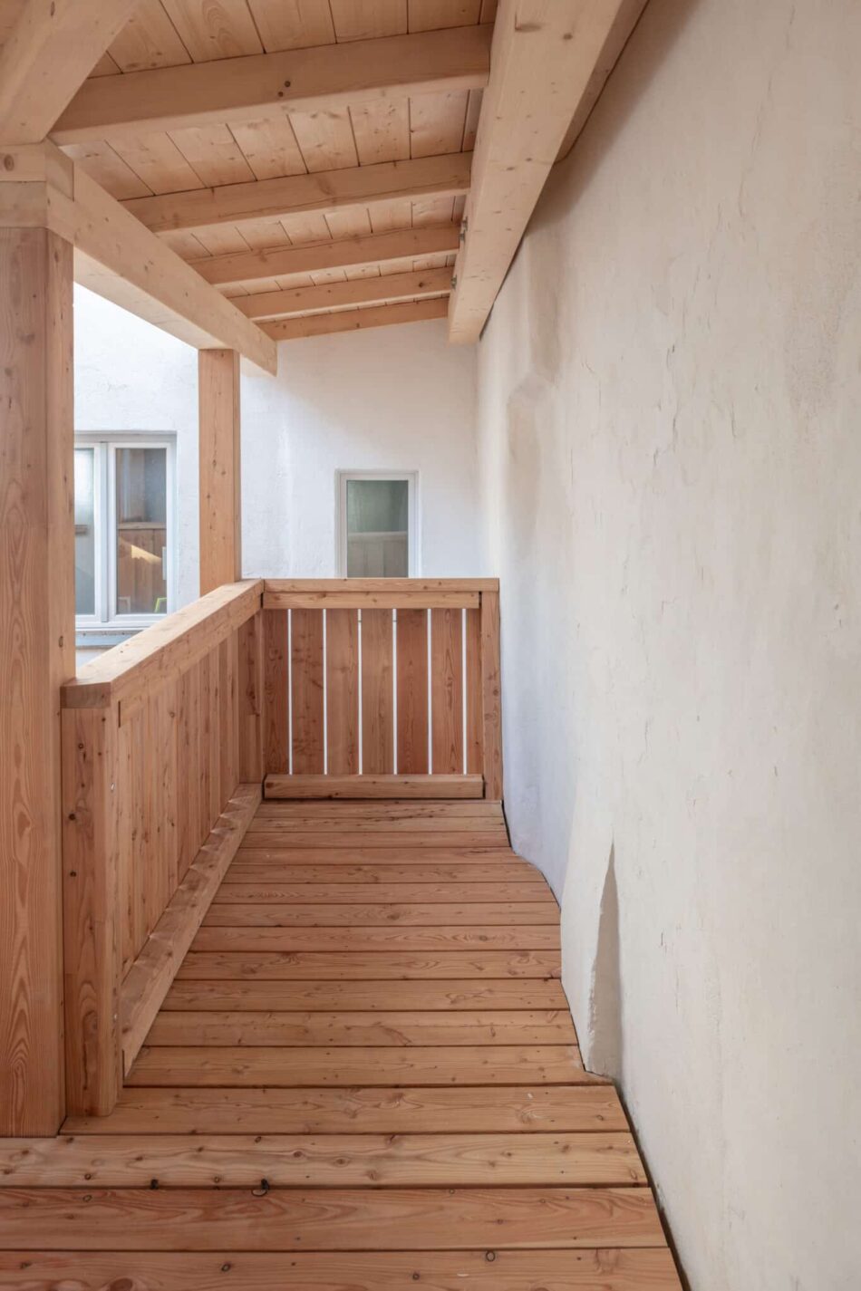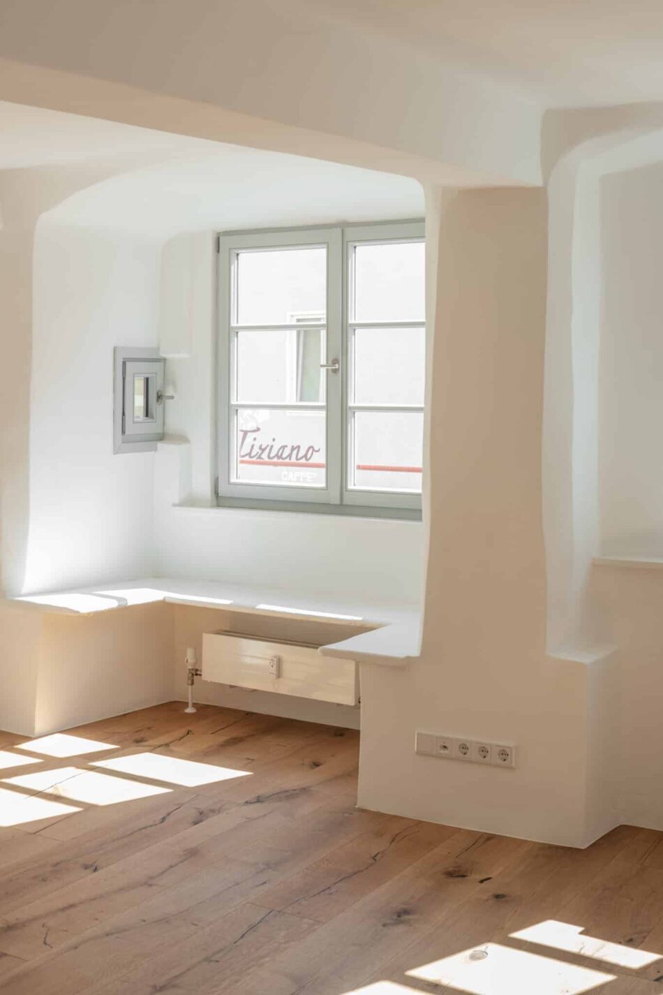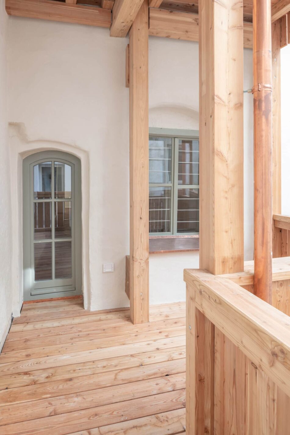 Verschiedene Oberflächen von alt bis neu verbinden den historischen Charme mit zeitgemäßem Wohnkomfort. Alle Fenster wurden durch neue Holzfenster ersetzt. Im gesamten Gebäude kamen ausschließlich hochwertiger Kalkputz und Kalkfarbe zum Einsatz. Wo es bauphysikalisch sinnvoll war, wurde zusätzlich Wärmedämmputz verwendet.