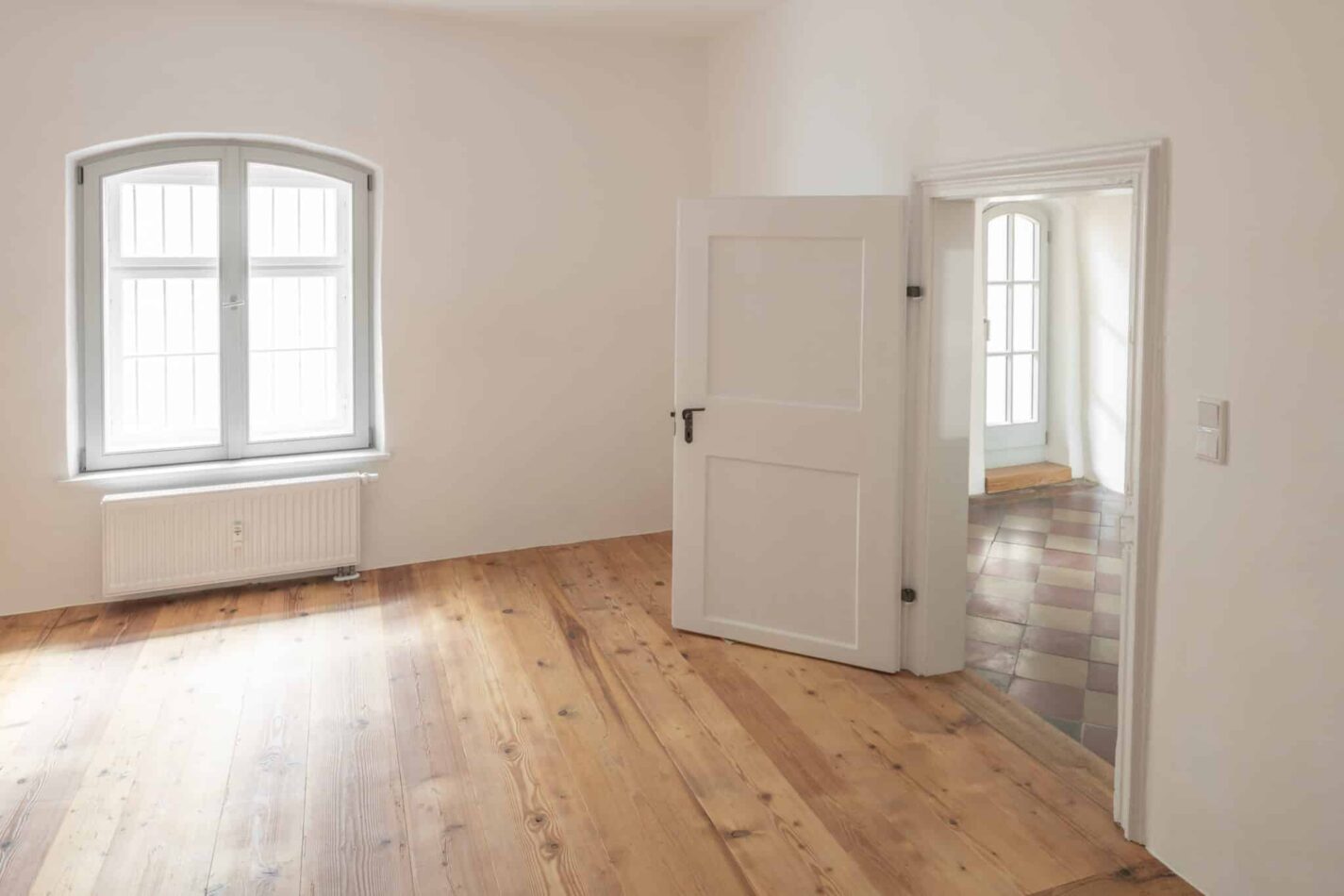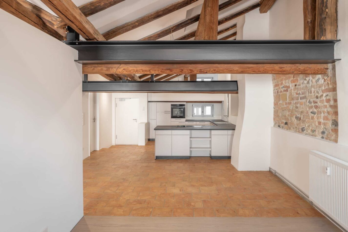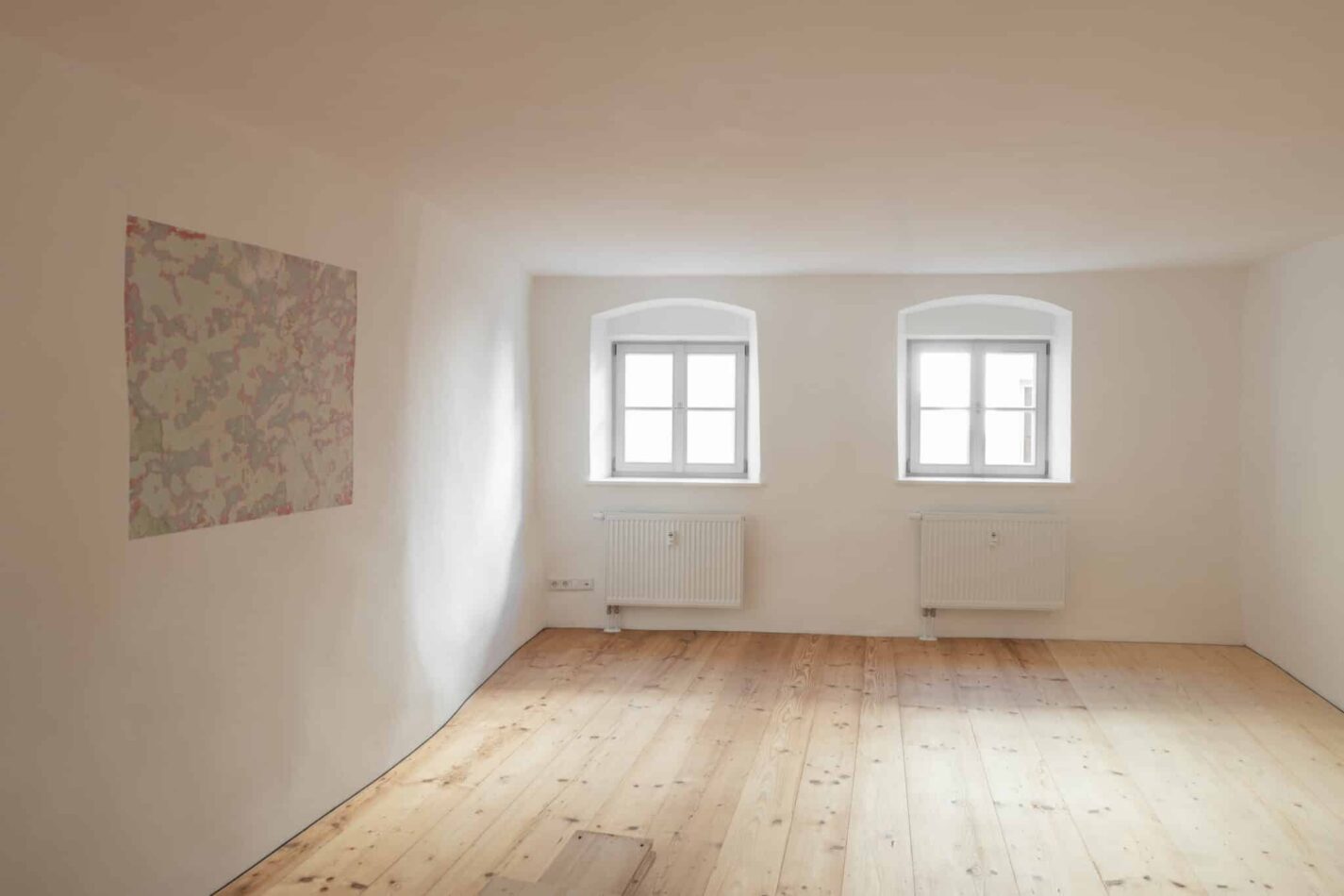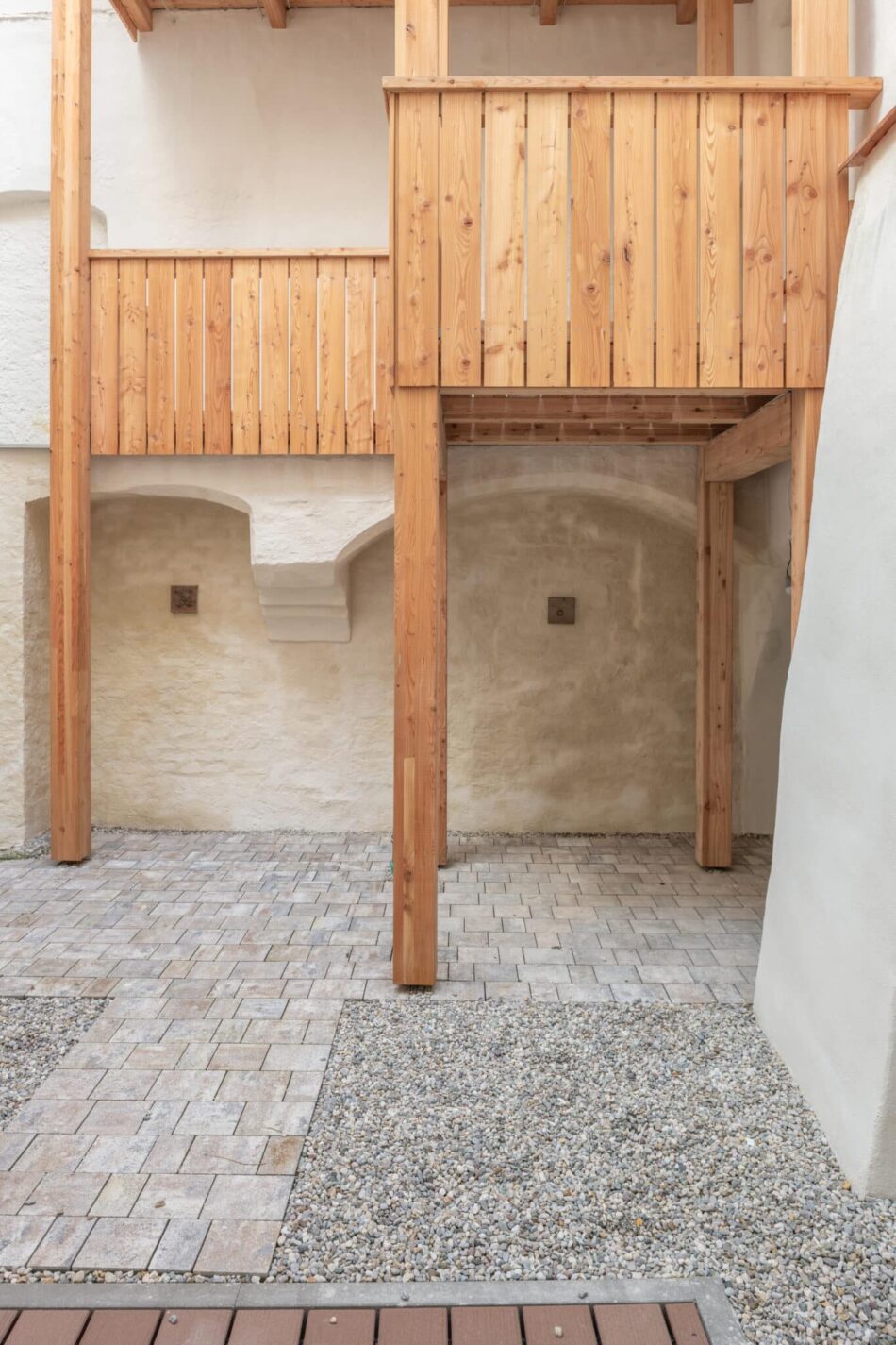 Verschiedene Oberflächen von alt bis neu verbinden den historischen Charme mit zeitgemäßem Wohnkomfort. Alle Fenster wurden durch neue Holzfenster ersetzt. Im gesamten Gebäude kamen ausschließlich hochwertiger Kalkputz und Kalkfarbe zum Einsatz. Wo es bauphysikalisch sinnvoll war, wurde zusätzlich Wärmedämmputz verwendet.