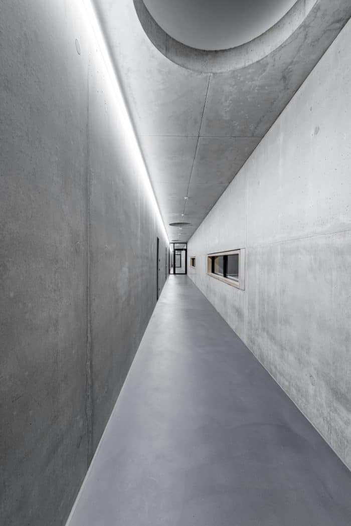 Die kompakten Gebäudeteile des Neubaus ergeben ein günstiges Verhältnis der Hüllfläche zum Raumvolumen. Die extensive Dachbegrünung bildet einen mechanischen Schutz der Dachhaut und fungiert als Regenwasserspeicher.