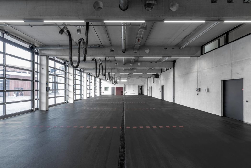 Die einzelnen Nutzungsbereiche sind deutlich ablesbar, verbinden sich aber durch eine einheitliche Materialität zu einem Architekturensemble. Die geschlossenen Außenwandflächen mit einer profilierten Metallbekleidung bilden einen spannungsreichen Kontrast zu den großflächigen Verglasungen und Toren. Eine funktionale sowie gestalterisch überzeugende Lösung. Die Realisierung erfolgte in drei Bauabschnitten.