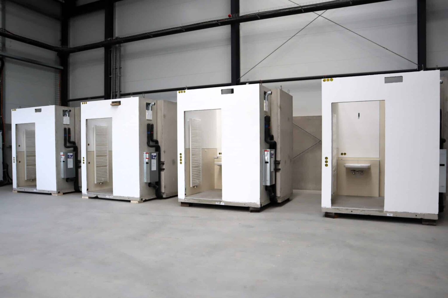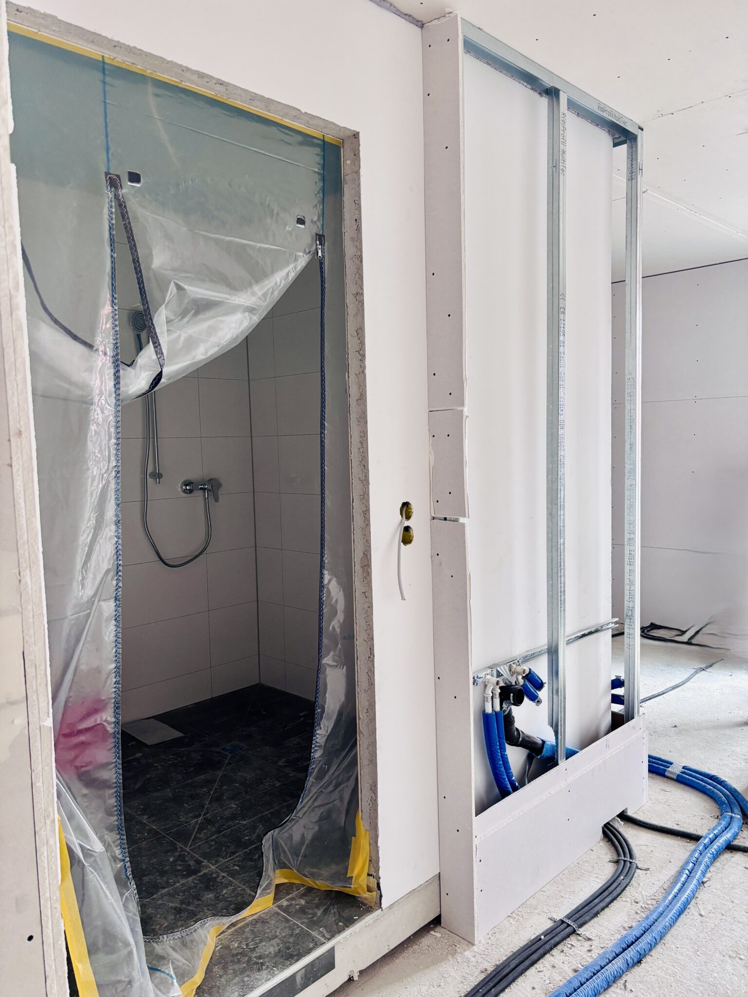 Die komplexen Herausforderungen der Sanitärgewerke löste Dennert mit 26 komplett vormontierten und werkseitig gefliesten Badmodulen, die in den Rohbau eingesetzt wurden und lediglich noch an die Gebäudetechnik angeschlossen werden mussten. „Der serielle Ansatz ist die Antwort auf den Fachkräftemangel, auch die aufwendige Koordination verschiedener Gewerke wie Estrich, Trockenbau, Fliesen, TGA-Installation, Sanitär und Malerarbeiten entfällt“, betont Wolfgang Dempert von Dennert.