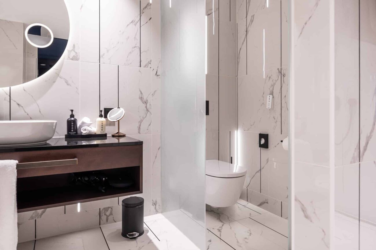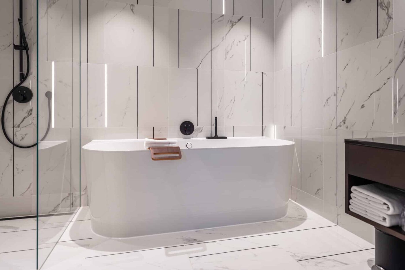 In den 126 Zimmern und Suiten setzen Subway 2.0 Tiefspül-WCs und ViClean Dusch-WCs, sowie die Oberon 2.0 Badewanne hohe Standards in Funktionalität und hygienischer Effizienz. Die eleganten Formen und hochwertigen Materialien fügen sich perfekt in das edle Interieur-Konzept des Hotels ein.