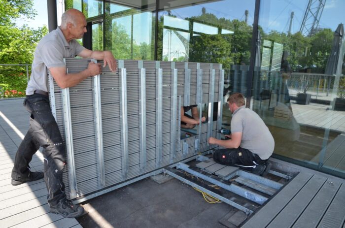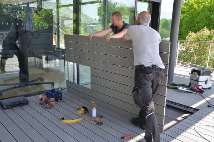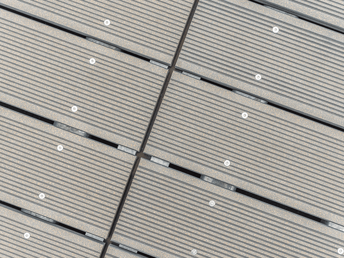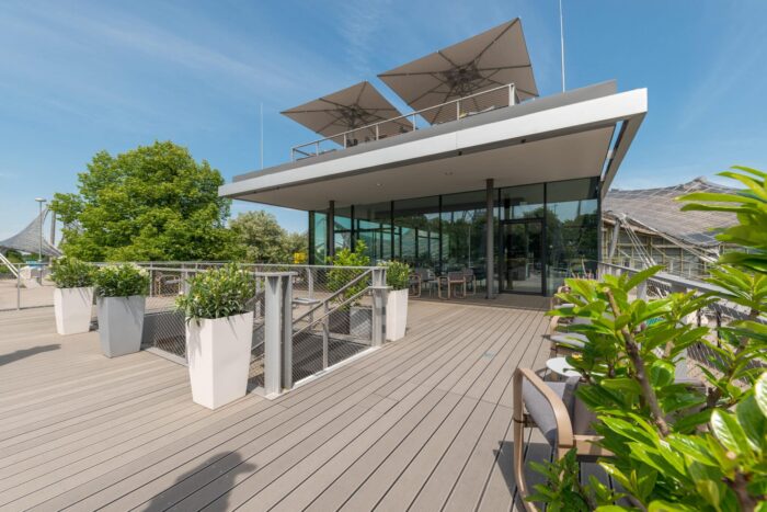 Nach Beendigung des dreimonatigen Tests stand das Ergebnis der Bemusterung fest: Die Wahl fiel auf die Terrassendiele „Die Beliebte massiv“ in Steingrau, eine Holzverbundwerkstoff-Diele von Naturinform im Vollprofil. Das Material konnte alle Anforderungen erfüllen: Nahezu verwindungsfrei und extrem pflegeleicht ist die Terrassendiele äußerst robust gegen mechanische und chemische Einwirkungen. Aufgrund der Materialzusammensetzung versprechen die Dielen eine hohe Langlebigkeit, splittern nicht und sind somit auch barfußtauglich. Die gefordert hohe Rutschhemmung konnte mit R13 auf beiden Seiten zudem erfüllt werden. Weiterhin war es den Architekten sehr wichtig, dass die Farbgebung dem vergrauten Robinien-Belag entsprach, was mit der Terrassendiele in Steingrau auch nach dreimonatiger Verwitterung gegeben war. Nach Vorgabe fügt sich der Farbton hervorragend in die Architektur und Materialwahl des Gebäudes ein.