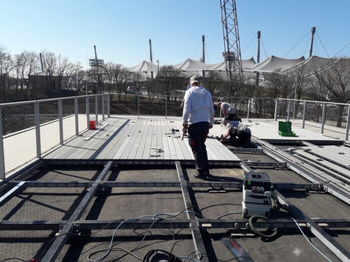 Der Zuschlag für die Ausführung wurde der Firma Paintner Holzbau aus Ergolding im Januar 2022 erteilt. Damit kam ein in mehrfacher Hinsicht sportliches Projekt auf die erfahrenen Holzbauer zu: Durch die Ukraine-Krise und die Nachwehen der Pandemie war mit Lieferengpässen zu rechnen. Doch auch die projektbezogenen Bedingungen waren knifflig, da nun wieder Veranstaltungen in der Olympiahalle stattfanden und die Arbeitsflächen rund um die Coubertin-Terrassen als notwendige Fluchtwege dienen. Das bedeutete, dass bei anstehenden Veranstaltungen die Baustelle – teilweise auch mehrere Tage hintereinander – ruhen musste. Der Auftragnehmer war, um dem engen Zeitrahmen gerecht zu werden, gefordert, eine Lösung zu finden, damit der Austausch des Belags in minimaler Montagezeit vonstatten gehen konnte.