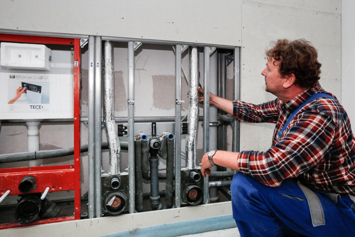 Die industrielle Vorfertigung garantiert nicht nur einen hohen Qualitätsstandard. Vor allem stehen die Kosten von Anfang fest und sind transparent – für den Handwerksunternehmer und den Bauherren. Das schafft für alle Beteiligten zusätzliche Planungssicherheit. Julian Rüsen, der zuständige Projektleiter von Ten Brinke ist zufrieden: „Das ist nicht das erste Projekt, bei dem wir TECEsystem Register einsetzen. Verglichen mit konventionell aufgebauten Vorwänden sparen wir dank der Vorfertigung gut 50 Prozent Installationszeit.“ Die Register wurden individuell für die vier unterschiedlichen Badgrundrisse geplant, im TECE-Werk gefertigt und in 14 Teillieferungen anschlussfertig auf die Baustelle geliefert.
