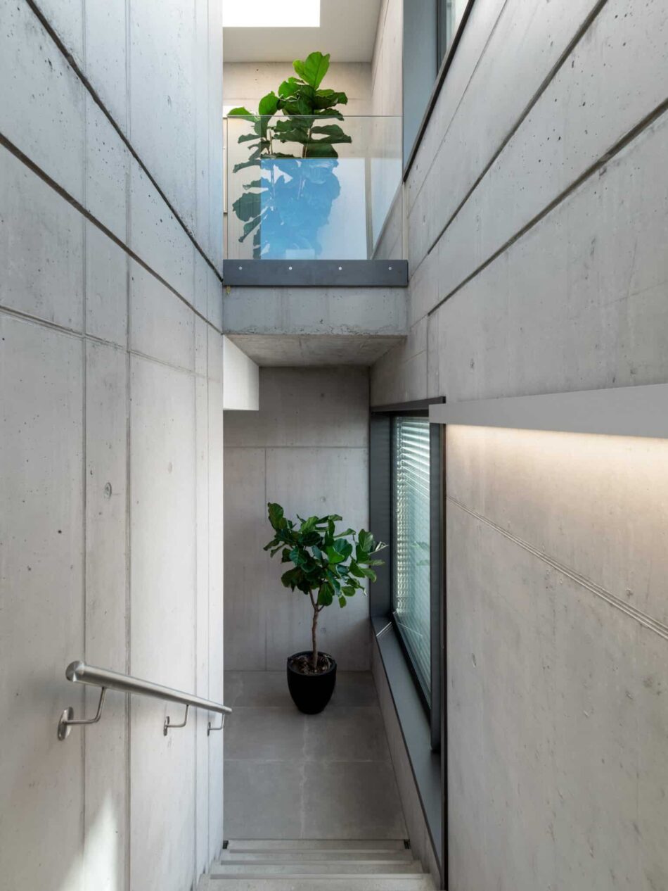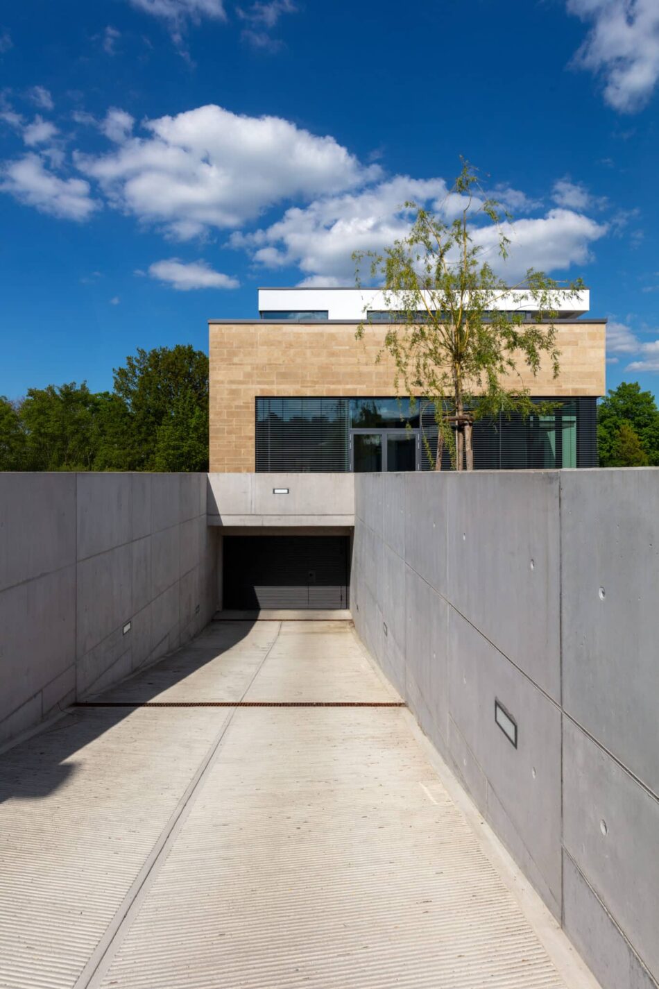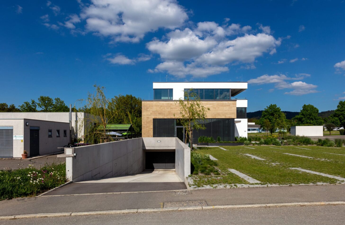 Auch der Außenraum folgt dieser reduzierten Haltung. Pflanzbeete, Steinwege, Sträucher und eine straßenseitige Blumenwiese ergänzen das Gebäude und schaffen eine ruhige Verbindung zwischen Bauwerk und Umgebung. So steht der Neubau im Bereich Bürogebäude für funktionale Eleganz und eine zeitgenössische Interpretation moderner Architektur.