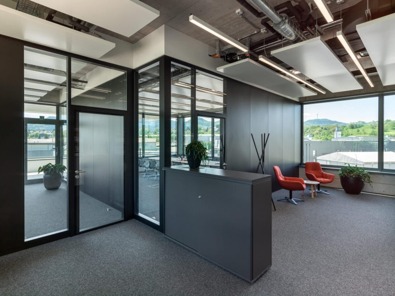 Großflächige Verglasungen prägen insbesondere den Verwaltungstrakt und lassen viel Tageslicht ins Innere. So entsteht eine transparente, offene Atmosphäre, die zeitgemäße Arbeits- und Schulungsräume definiert. Im Innenraum unterstreichen Sichtbetonflächen an Decken und Wänden sowie dunkle Fensterprofile mit schlanken Rahmen den puristischen Charakter des Gebäudes. Die Architektur setzt auf Materialehrlichkeit und verzichtet bewusst auf dekorative Elemente zugunsten einer klaren, funktional entwickelten Gestaltung.