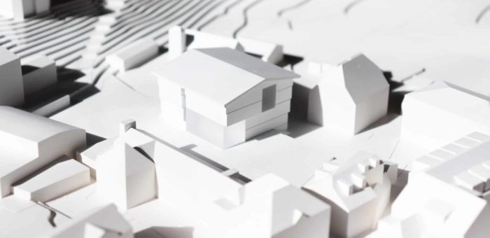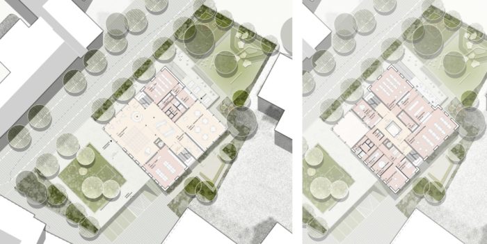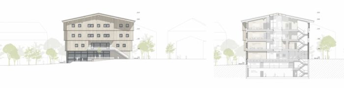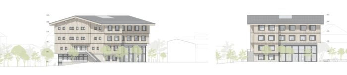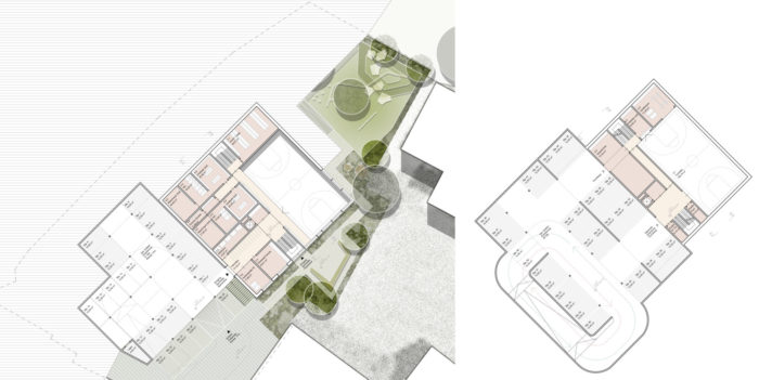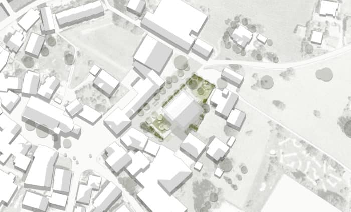 Städtebaulicher Leitgedanke ist eine solitäre Baukörpersetzung, welche sich parallel zum Bestandsgebäude der Volksschule orientiert und einen neu gedachten grünen Freiraum zwischen Jakob-Stemer-Weg und Gerichtweg als Auftakt des Bildungscampus inszeniert. Das neue Volksschulgebäude fungiert durch seine sensible Setzung als eine Art Konnektor und Vermittler, welcher stadträumliche Platzfolgen miteinander verzahnt, weiterdenkt. Neben den freiraumplanerischen Aspekten vermittelt und verbindet das Gebäude auch im Spannungsfeld zwischen Alt und Neu. Die Anlehnung an das traditionelle Vorarlberger Bauernhaus geht in einen kreativen Dialog zwischen Denkmalpflege und zeitgenössischer Architektur. Ziel des Entwurfs ist es die wertvolle, teils ländliche als auch städtische Bausubstanz von Schruns zu bewahren und dem Bestand gleichzeitig etwas Neues und Ebenbürtiges hinzuzufügen.