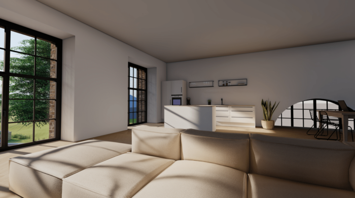 Die Außenwände der alten Scheune bleiben bestehen, so bleibt der Charakter und der Charme des Gebäudes erhalten.