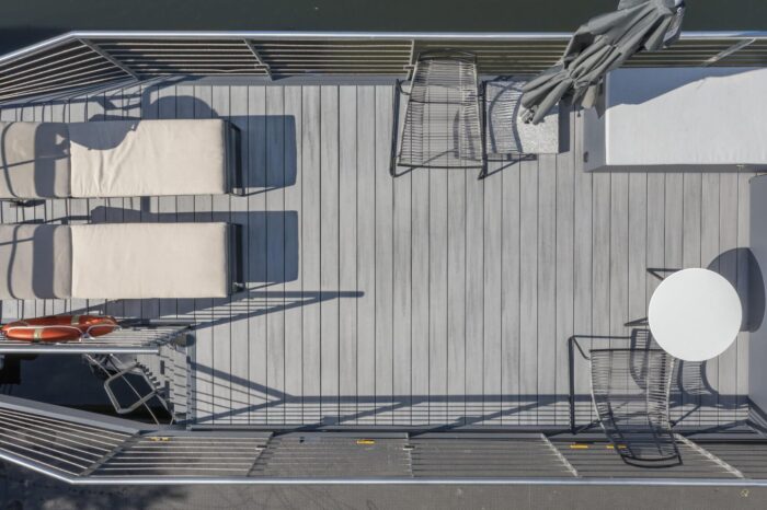 Der optimale Belag für das Oberdeck der Hausboote ist im Wasserumfeld robust und widerstandsfähig, außerdem rutschfest und barfußfreundlich. Neben der Wartungsfreiheit und Pflegefreundlichkeit sind dies alles Kriterien, die für Dielen aus dem Portfolio von Naturinform sprechen. Aufgrund ihrer natürlichen Optik und Haptik entschied man sich bei SBS für „Die Naturlinie“. Ein innovatives Herstellungsverfahren gibt dieser Diele aus nachhaltigem Holzverbundwerkstoff eine individuelle, natürliche mehrfarbige Holzmaserung und eine angenehme Oberflächenstruktur. Das gewählte kühle Graphitgrau passt perfekt zum klaren, puristischen Design der Hausboote.