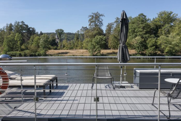 Hausboote sind derzeit ziemlich angesagt und in den letzten Sommern zählten die schwimmenden Ferienhäuser zu den herausragendsten Urlaubstrends. Bereits seit Jahren spürt die Branche der Bootsbauer und -verleiher ein starkes Wachstum und parallel zum Caravaning-Boom hat die Pandemie diesen Trend weiter verstärkt. Auf diese Entwicklung im Urlaubs- und Freizeitverhalten reagiert das Andernacher Unternehmen Delphin-Tec Schiffstechnik und baut sein Angebot an Hausbooten konsequent aus. Seit letztem Sommer schippern die Boote aus der Serie „Joylife Boats“ entlang von Saar und Mosel. Mit an Bord: „Die Naturlinie“ in Graphitgrau von Naturinform. Zusammen mit dem Spezialbootsbauer SBS Andernach setzte es hier nicht wie im Schiffsbau üblich auf den Werkstoff Holz, sondern stattete das Oberdeck mit der Massivdiele des nordbayerischen Spezialisten für Holzverbundwerkstoffe aus.