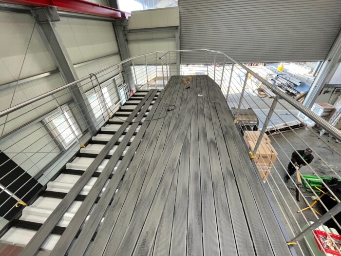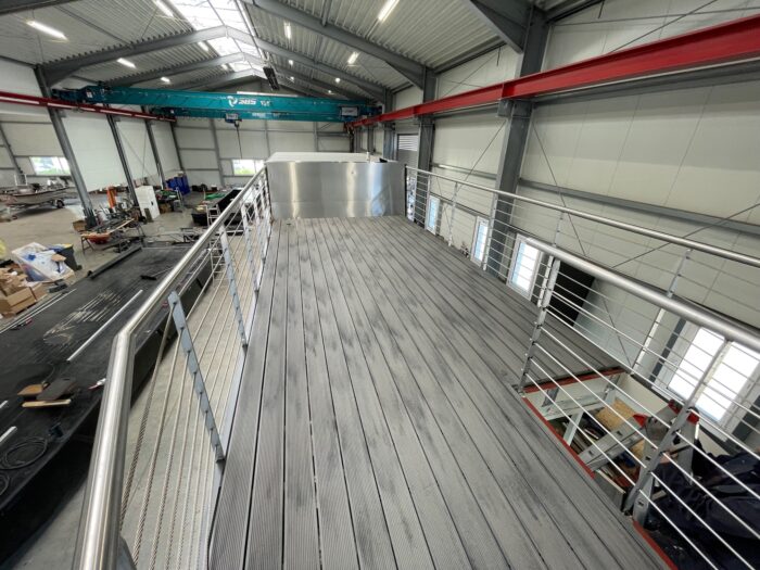 Im Bootsbau wird traditionsgemäß mit Holz gearbeitet, aber den nachhaltigen Holzverbundwerkstoffen von Naturinform ist es gelungen, neues Terrain zu erobern. „Vor Jahren habe ich mir eine Terrasse mit Dielen von Naturinform bauen lassen – und bis zum heutigen Tage bin ich damit sehr zufrieden. Mich begeistert nicht nur die schöne Optik des Materials, ich bin auch von der Langlebigkeit und dem geringen Wartungsaufwand absolut überzeugt. Also warum sollten wir es nicht ebenso im Bootsbau mit Naturinform-Dielen versuchen?“, so der SBS-Geschäftsführer. Deshalb wurden die Beläge in der Werft in Andernach auf dem Oberdeck verbaut. Die Verarbeitung des „neuen Materials“ gestaltete sich für die Mitarbeiter, die in der Vergangenheit hier stets mit Holz zu tun hatten, laut Alex Friesen als „sehr unkompliziert und angenehm. Die Vorgaben und Verarbeitungshinweise seitens des Herstellers sind sehr präzise, das Gesamtpaket inklusive Befestigungstechnik bzw. Unterbau passt. Alles ist prima gelaufen und mit dem Ergebnis sind wir außerordentlich zufrieden.“ Verwendet wurde die Massivdiele „Die Naturlinie“ in Graphitgrau in der Sonderlänge von 7 Metern, außerdem das Basisprofil in 40 x 60 Millimeter und einer Länge von 4 Metern in Anthrazit zum Klicken auf einem Drehfuß als Unterkonstruktion. Als Höhenausgleich fungierten Gummipads in 60 x 60 x 3 Millimeter.