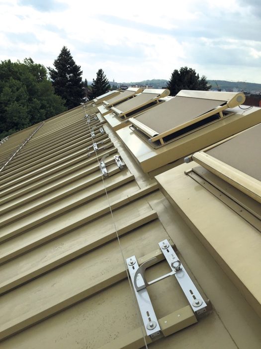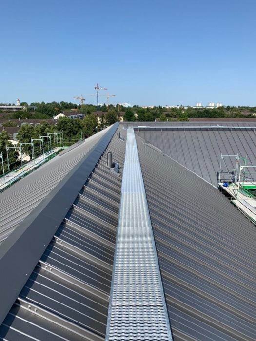 Metalldächer sind vergleichsweise wartungsarm, da sie wasserundurchlässig und robust sind, kein unerwünschtes Mooswachstum aufweisen und korrosionsbeständig sind. Nichtsdestotrotz gibt es Wartungsarbeiten, die eine Dachbegehung erfordern – zum Beispiel wenn Grünflächen oder PV-Anlagen vorhanden sind, aber auch um Lüftungsanlagen oder RWA-Systeme instand zu halten. BEMO liefert zertifizierte und zugelassene Lösungen, die eine Dachbegehung und Wartung sicher machen.