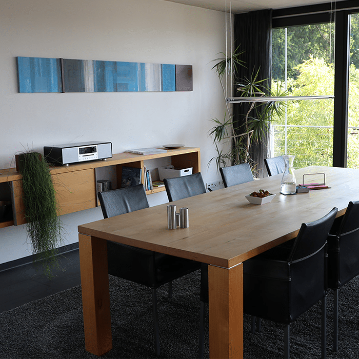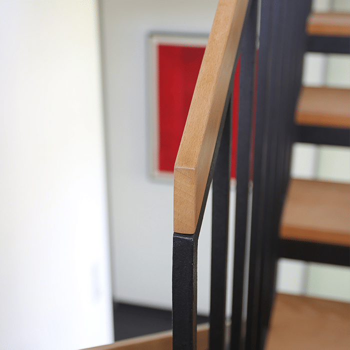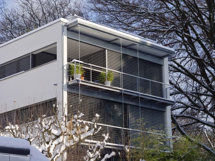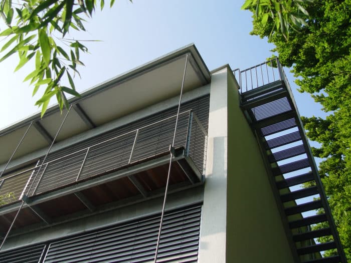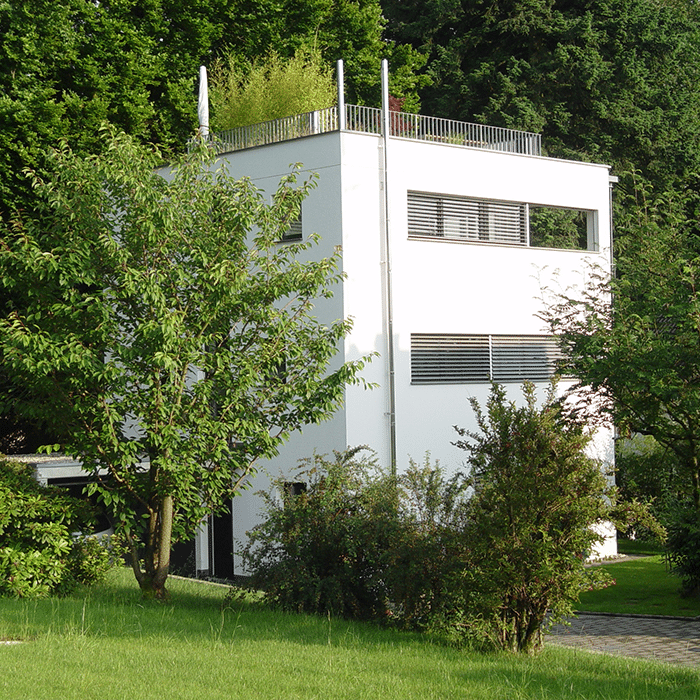 Das dreigeschossige Wohngebäude mit einer Grundfläche von 8,00m x 8,00m wurde auf einem Grundstück mit lediglich 240 qm Grundstücksfläche errichtet. Das Wohngeschoss befindet sich auf der obersten Etage mit Zugang zur Dachterrasse, von der aus man den Blick in Richtung der Lindauer Insel genießen kann. Das Gebäude besticht durch seine klare, reduzierte Formensprache, die sich auch im Inneren widerspiegelt. Die Oberflächen wurden auf drei Materialien reduziert – Decken in Sichtbeton – Wände weiß verputzt – Böden als anthrazitgraue Keramikbeläge. Eine feingliedrige Stahltreppe mit Holzstufen verbindet die einzelnen Geschosse. Die Südseite wurde vollflächig verglast, wodurch das Licht tief ins Gebäude eindringen kann.